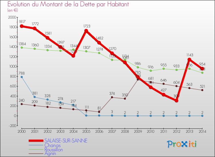 A noter : la valeur moyenne de la dette par habitant des communes françaises similaires à Salaise-sur-Sanne était de 794 € par habitant, en 2014.