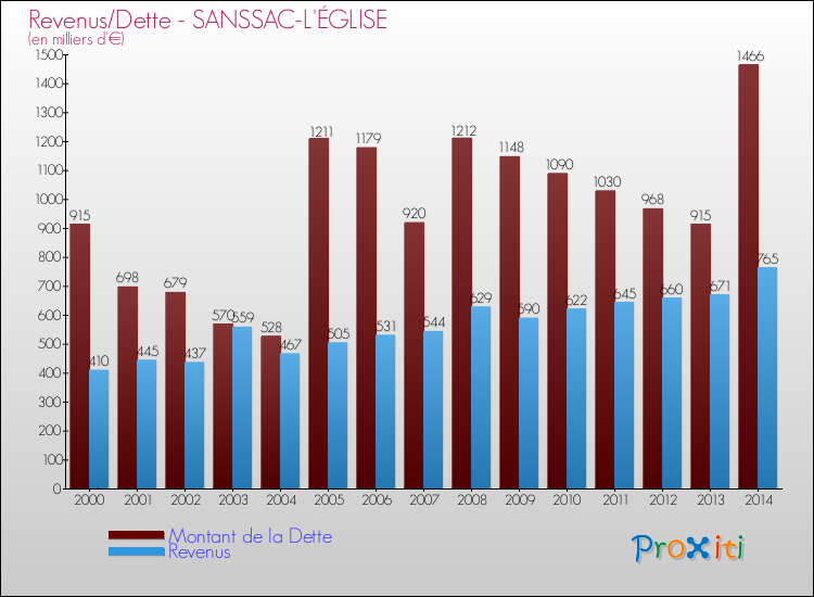 Comparaison de la dette et des revenus pour SANSSAC-L'ÉGLISE de 2000 à 2014