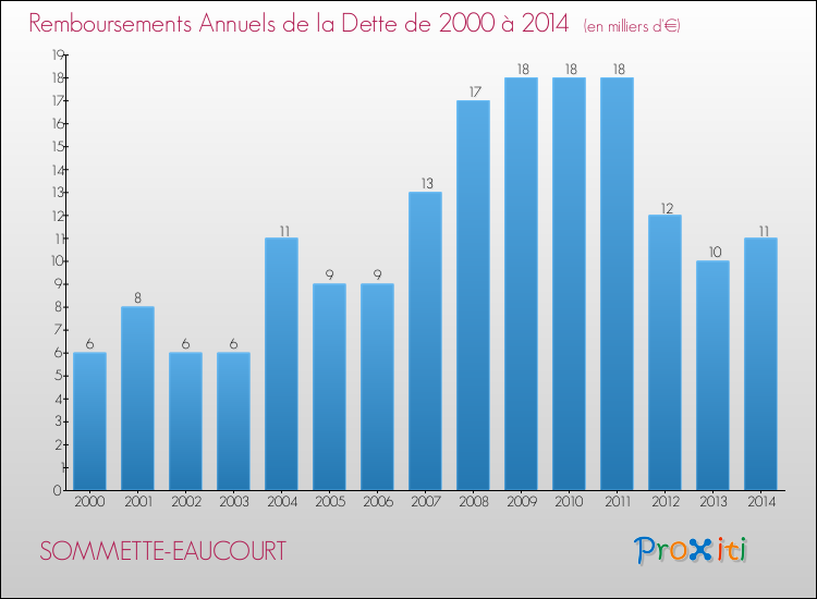 Pendant la même période, les communes françaises similaires à Sommette-Eaucourt, ont vu leur dette par habitant augmenter de 50.57 % en moyenne entre 2000 et 2014.
