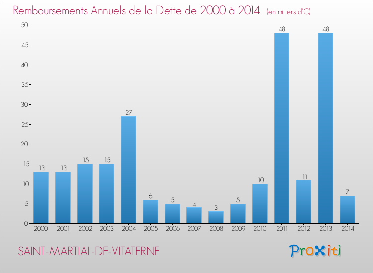 A Saint-Martial-de-Vitaterne, la dette par habitant a donc baissé de 37.14 % entre 2000 et 2014.