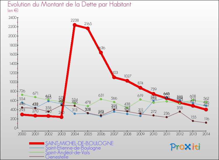 Le graphique ci-dessous représente l'évolution de la dette par habitant à Saint-Michel-de-Boulogne depuis 2000.