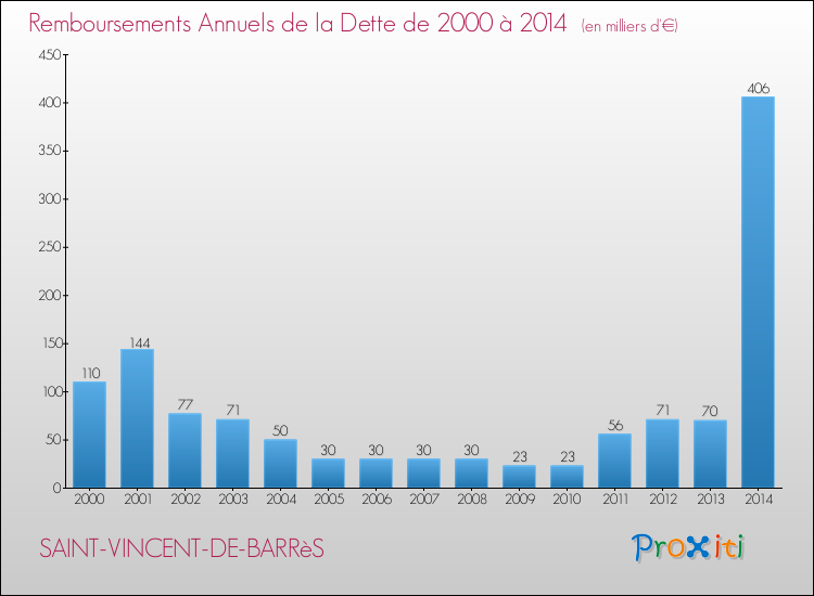 A Saint-Vincent-de-Barrès, ce montant de la dette est pourtant en baisse de 89.84 % par rapport à 2013.