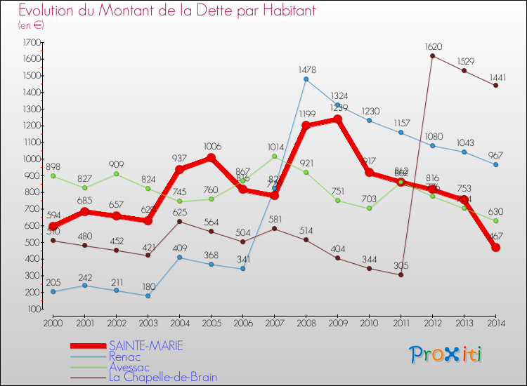 Par rapport aux 2373 habitants de Sainte-Marie, en 2014 le poids de cette dette représente 467 € par habitant.