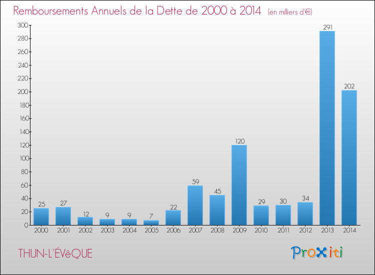 Par rapport aux 695 habitants de Thun-l'Évêque, en 2014 le poids de cette dette représente 386 € par habitant.