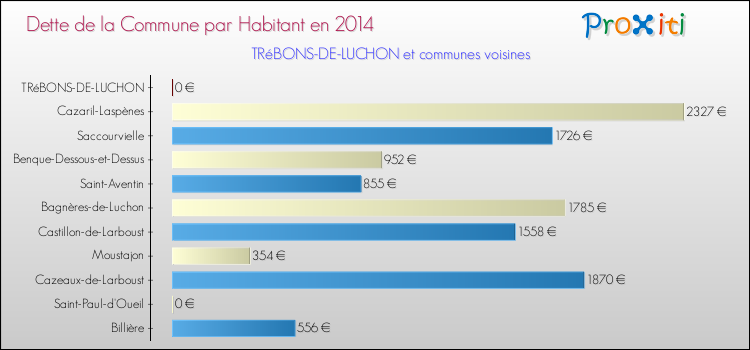 Par rapport aux 9 habitants de Trébons-de-Luchon, en 2014 le poids de cette dette représente 0 € par habitant.