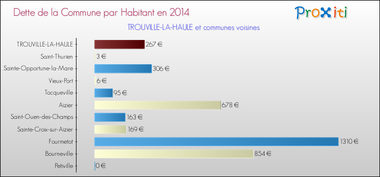 A noter : la valeur moyenne de la dette par habitant des communes françaises similaires à Trouville-la-Haule était de 703 € par habitant, en 2014.