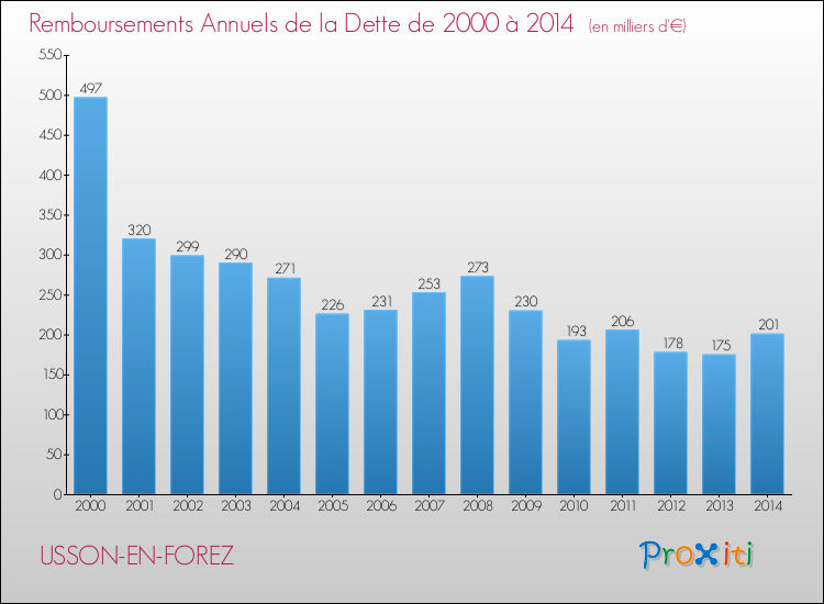 A Usson-en-Forez, la dette par habitant a donc baissé de 49.36 % entre 2000 et 2014.