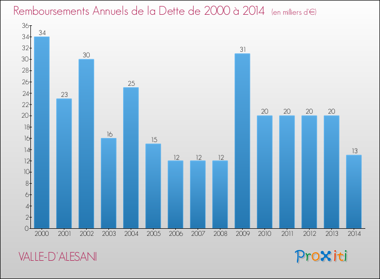 A Valle-d'Alesani, la dette par habitant a donc augmenté de 22.93 % entre 2000 et 2014.