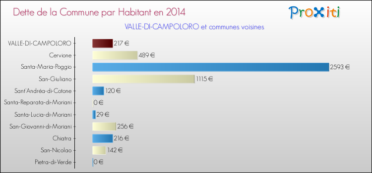 Par rapport aux 343 habitants de Valle-di-Campoloro, en 2014 le poids de cette dette représente 217 € par habitant.