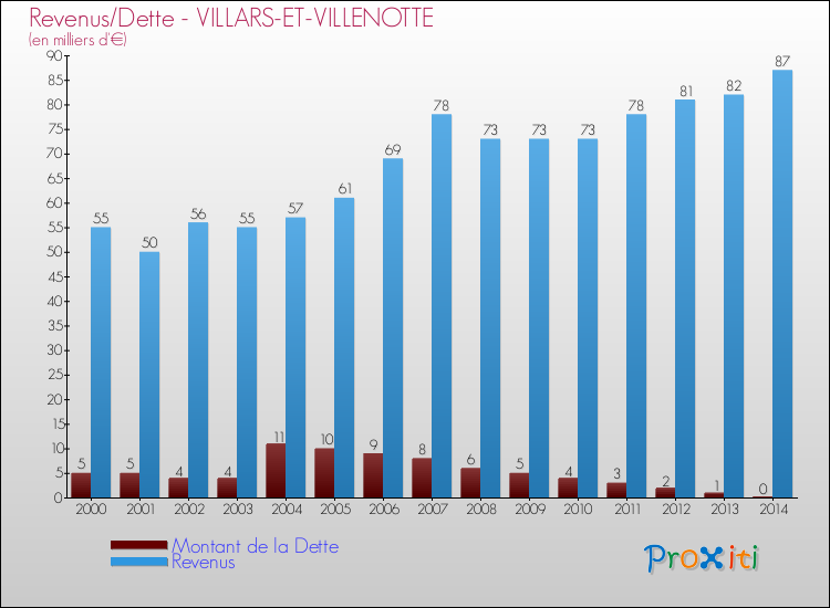 Comparaison Revenus/Dette de Villars-et-Villenotte (de 2000 à 2014)