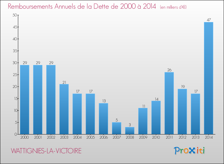 Par rapport aux 265 habitants de Wattignies-la-Victoire, en 2014 le poids de cette dette représente 71 € par habitant.