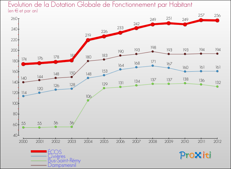 Le graphique ci dessous indique la Dotation Globale de Fonctionnement accordée par habitant à Écos en 2012 par rapport aux communes voisines.