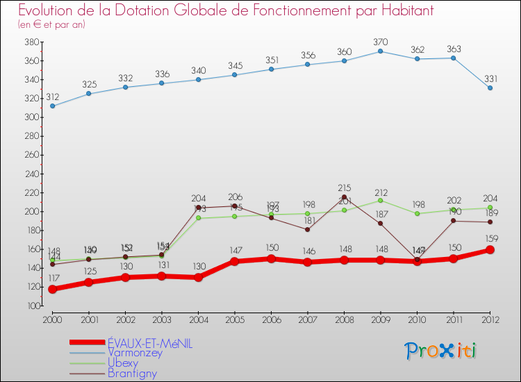 Le graphique ci dessous indique la Dotation Globale de Fonctionnement accordée par habitant à Évaux-et-Ménil en 2012 par rapport aux communes voisines.