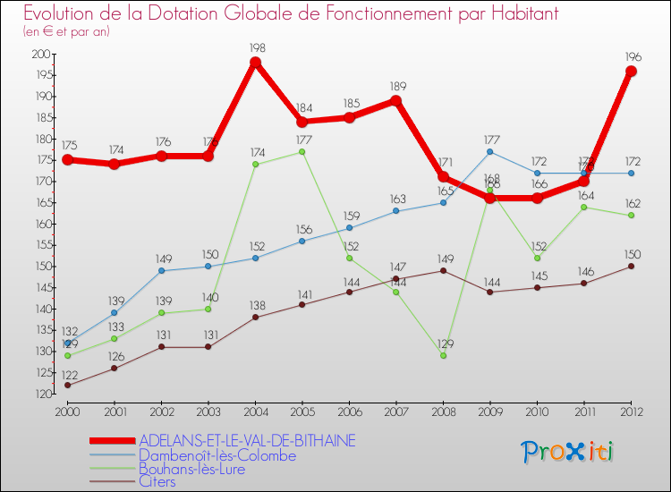 Le graphique ci dessous indique la Dotation Globale de Fonctionnement accordée par habitant à Adelans-et-le-Val-de-Bithaine en 2012 par rapport aux communes voisines.