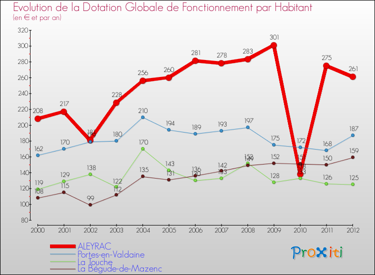 Dans le même temps, la Dotation Globale de Fonctionnement accordée aux communes françaises similaires à Aleyrac était de 228 € par habitant, en 2012.
