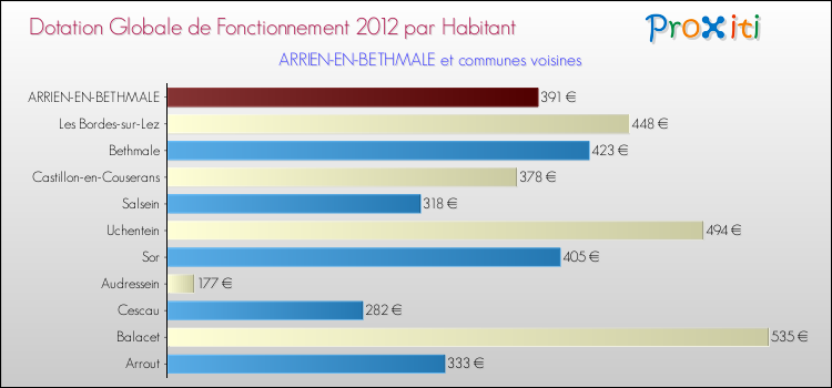 Le graphique ci dessous indique la Dotation Globale de Fonctionnement accordée par habitant à Arrien-en-Bethmale en 2012 par rapport aux communes voisines.