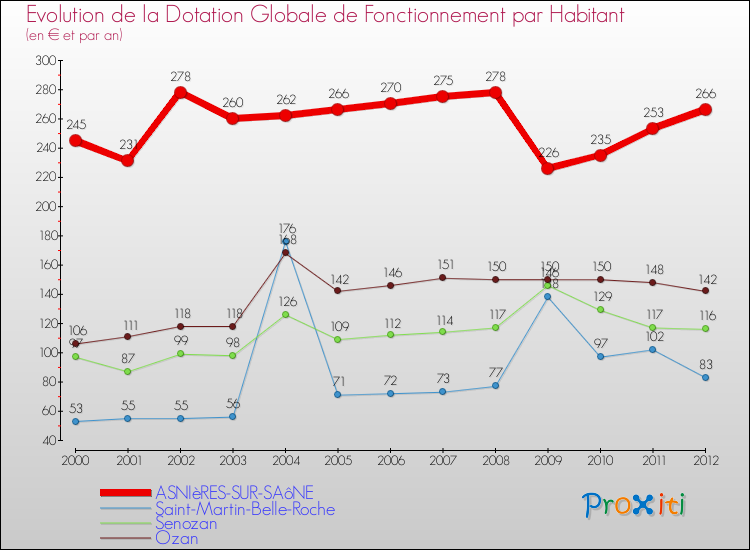 Dans le même temps, la Dotation Globale de Fonctionnement accordée aux communes françaises similaires à Asnières-sur-Saône était de 228 € par habitant, en 2012.