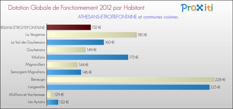 Le graphique ci dessous indique la Dotation Globale de Fonctionnement accordée par habitant à Athesans-Étroitefontaine en 2012 par rapport aux communes voisines.