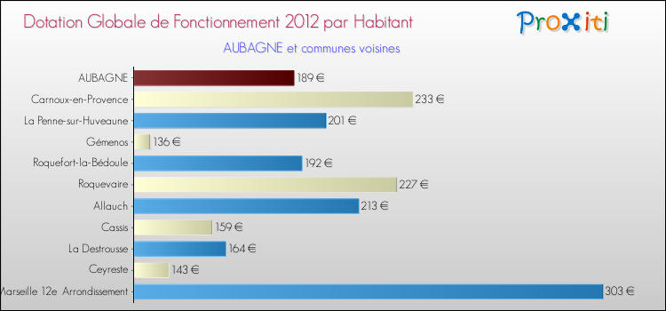 Dans le même temps, la Dotation Globale de Fonctionnement accordée aux communes françaises similaires à Aubagne était de 268 € par habitant, en 2012.