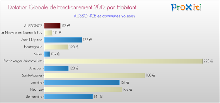 Le graphique ci dessous indique la Dotation Globale de Fonctionnement accordée par habitant à Aussonce en 2012 par rapport aux communes voisines.