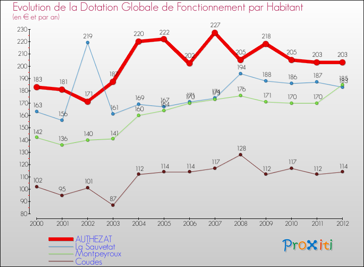 Dans le même temps, la Dotation Globale de Fonctionnement accordée aux communes françaises similaires à Authezat était de 255 € par habitant, en 2012.