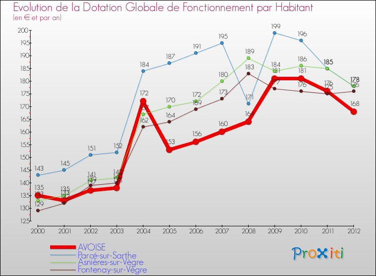 Dans le même temps, la Dotation Globale de Fonctionnement accordée aux communes françaises similaires à Avoise était de 173 € par habitant, en 2012.