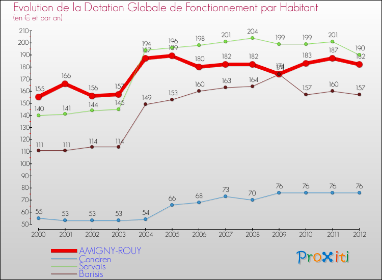 Dans le même temps, la Dotation Globale de Fonctionnement accordée aux communes françaises similaires à Amigny-Rouy était de 173 € par habitant, en 2012.