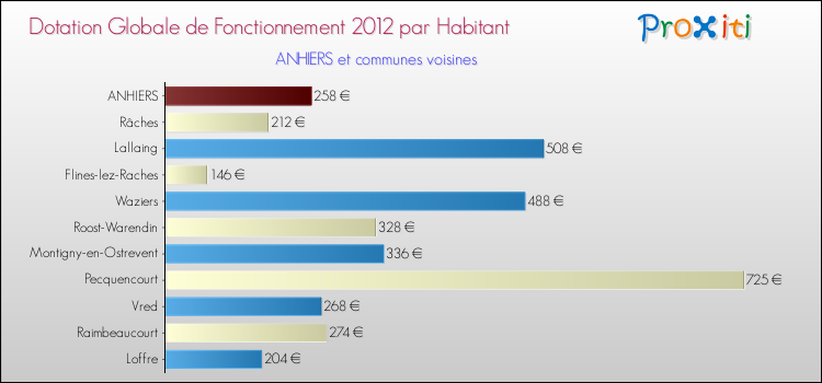 Le graphique ci dessous indique la Dotation Globale de Fonctionnement accordée par habitant à Anhiers en 2012 par rapport aux communes voisines.