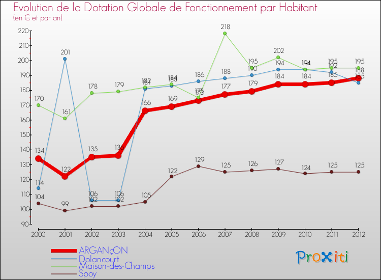 Dans le même temps, la Dotation Globale de Fonctionnement accordée aux communes françaises similaires à Argançon était de 232 € par habitant, en 2012.