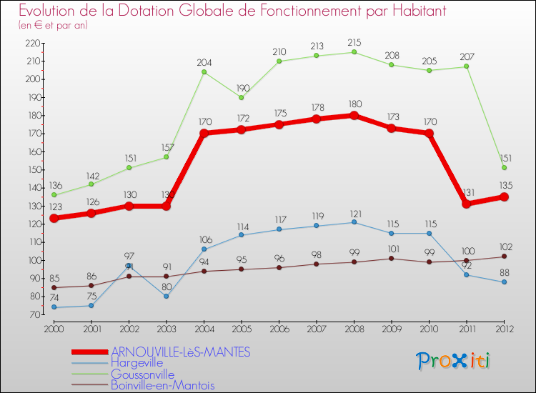 Dans le même temps, la Dotation Globale de Fonctionnement accordée aux communes françaises similaires à Arnouville-lès-Mantes était de 173 € par habitant, en 2012.