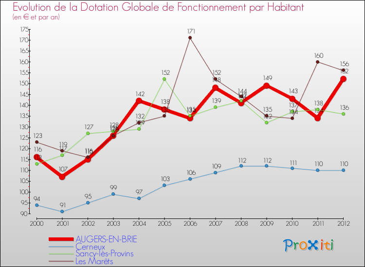 Dans le même temps, la Dotation Globale de Fonctionnement accordée aux communes françaises similaires à Augers-en-Brie était de 181 € par habitant, en 2012.