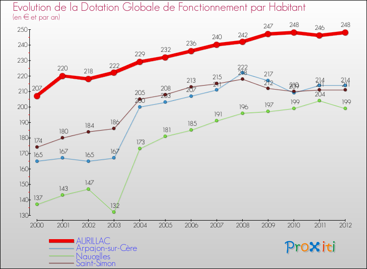 Dans le même temps, la Dotation Globale de Fonctionnement accordée aux communes françaises similaires à Aurillac était de 268 € par habitant, en 2012.