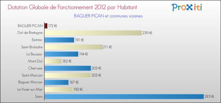 Le graphique ci dessous indique la Dotation Globale de Fonctionnement accordée par habitant à Baguer-Pican en 2012 par rapport aux communes voisines.