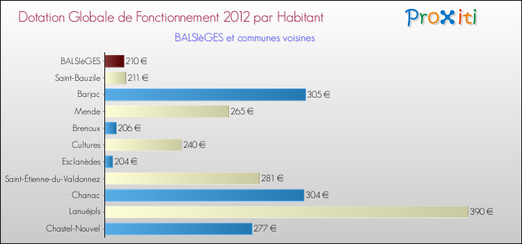 Le graphique ci dessous indique la Dotation Globale de Fonctionnement accordée par habitant à Balsièges en 2012 par rapport aux communes voisines.