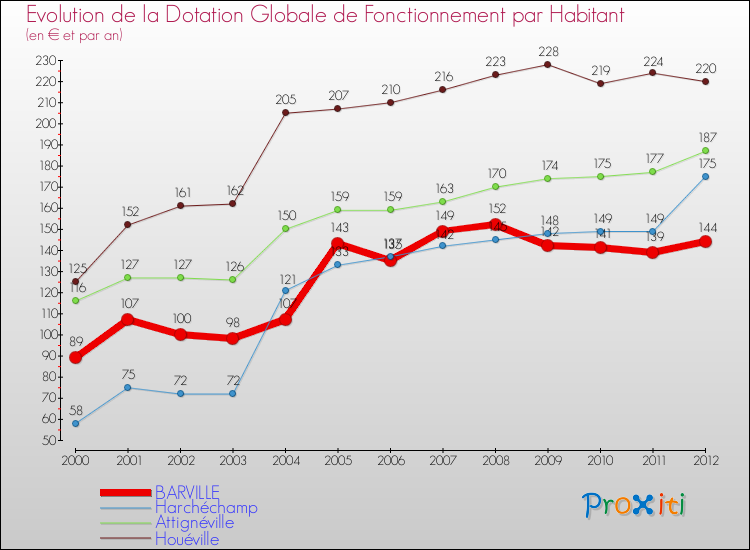 Dans le même temps, la Dotation Globale de Fonctionnement accordée aux communes françaises similaires à Barville était de 280 € par habitant, en 2012.