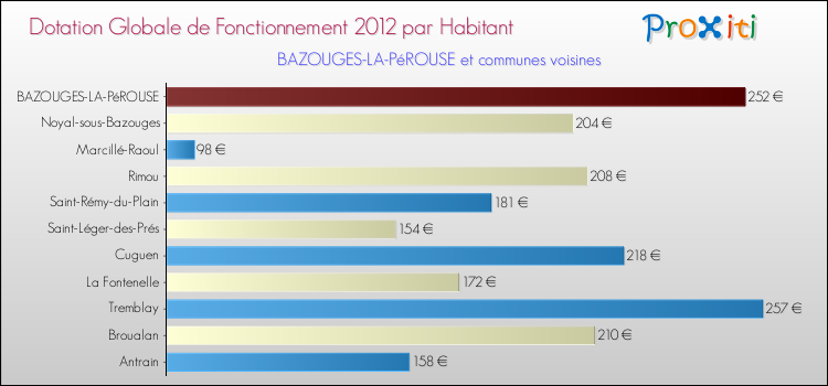 Le graphique ci dessous indique la Dotation Globale de Fonctionnement accordée par habitant à Bazouges-la-Pérouse en 2012 par rapport aux communes voisines.