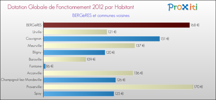 Le graphique ci dessous indique la Dotation Globale de Fonctionnement accordée par habitant à Bergères en 2012 par rapport aux communes voisines.