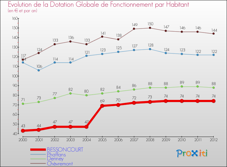 Dans le même temps, la Dotation Globale de Fonctionnement accordée aux communes françaises similaires à Bessoncourt était de 173 € par habitant, en 2012.