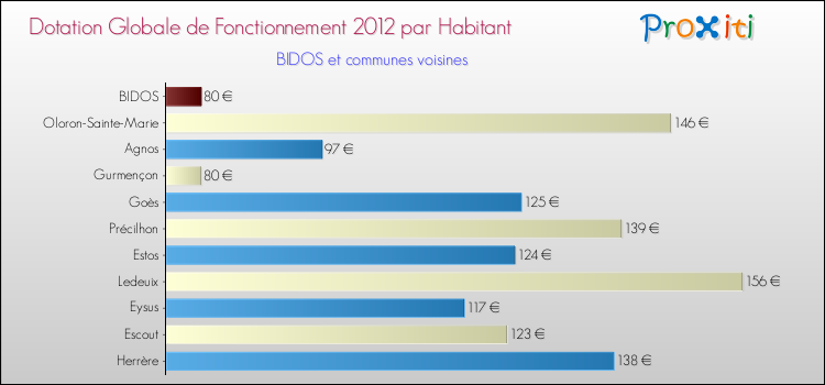 Le graphique ci dessous indique la Dotation Globale de Fonctionnement accordée par habitant à Bidos en 2012 par rapport aux communes voisines.