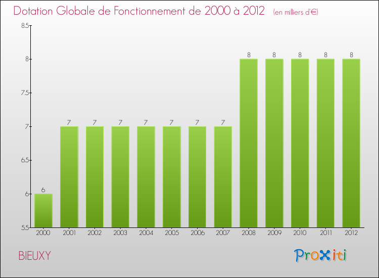 En effet, la dotation globale de fonctionnement versée par l'état en 2012 à la seule commune de Bieuxy était de : 8 000 € au total.