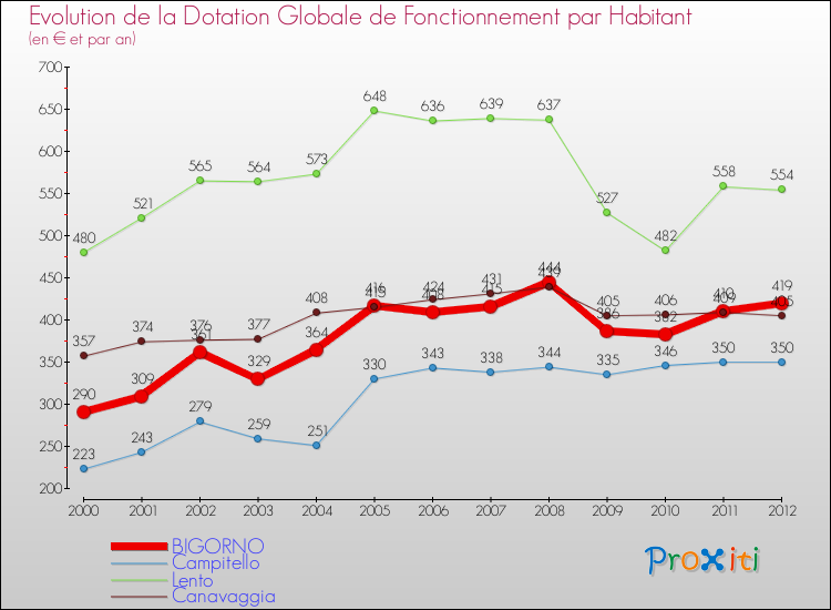 Dans le même temps, la Dotation Globale de Fonctionnement accordée aux communes françaises similaires à Bigorno était de 280 € par habitant, en 2012.