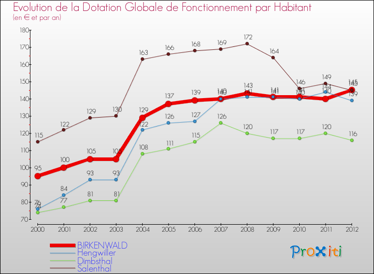 Dans le même temps, la Dotation Globale de Fonctionnement accordée aux communes françaises similaires à Birkenwald était de 200 € par habitant, en 2012.