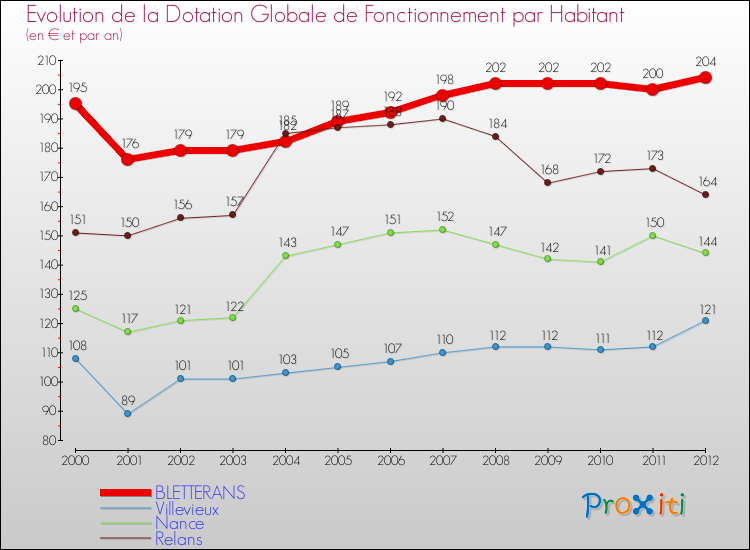Dans le même temps, la Dotation Globale de Fonctionnement accordée aux communes françaises similaires à Bletterans était de 173 € par habitant, en 2012.