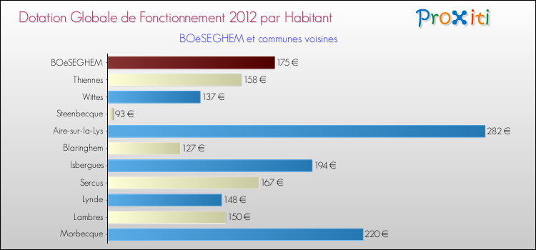 Le graphique ci dessous indique la Dotation Globale de Fonctionnement accordée par habitant à Boëseghem en 2012 par rapport aux communes voisines.