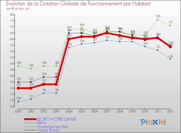 Dans le même temps, la Dotation Globale de Fonctionnement accordée aux communes françaises similaires à Boiry-Notre-Dame était de 181 € par habitant, en 2012.