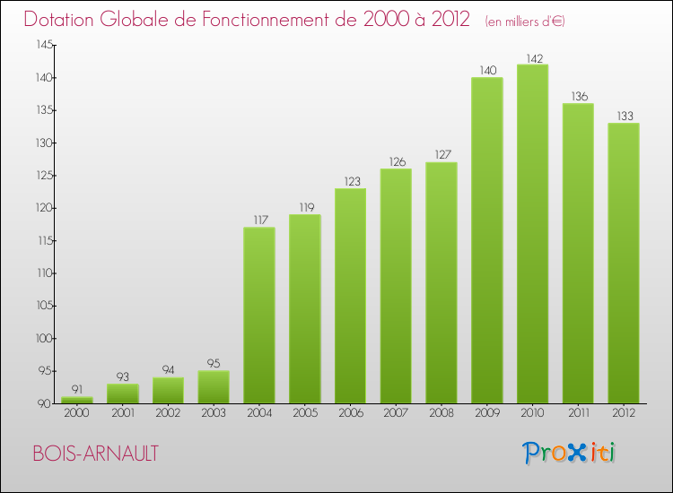 Dans le même temps, la Dotation Globale de Fonctionnement accordée aux communes françaises similaires à Bois-Arnault était de 214 € par habitant, en 2012.