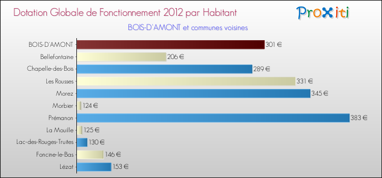 Le graphique ci dessous indique la Dotation Globale de Fonctionnement accordée par habitant à Bois-d'Amont en 2012 par rapport aux communes voisines.
