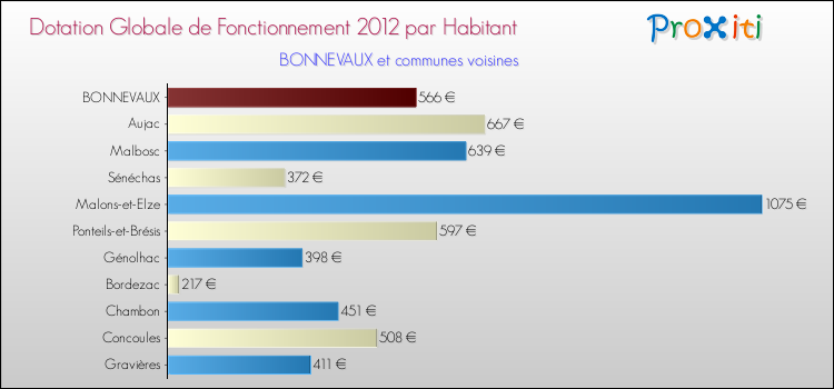 Le graphique ci dessous indique la Dotation Globale de Fonctionnement accordée par habitant à Bonnevaux en 2012 par rapport aux communes voisines.