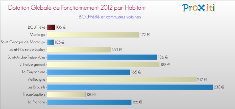 Le graphique ci dessous indique la Dotation Globale de Fonctionnement accordée par habitant à Boufféré en 2012 par rapport aux communes voisines.