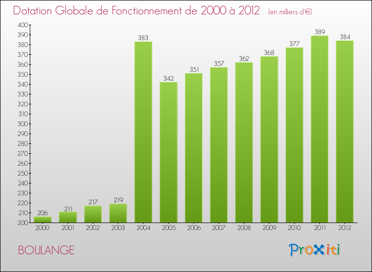 Dans le même temps, la Dotation Globale de Fonctionnement accordée aux communes françaises similaires à Boulange était de 183 € par habitant, en 2012.